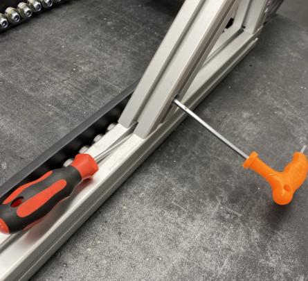 Bei der Installation der Beine an den Dogmills Standard ist es manchmal notwendig, mit einem flachen Schraubenzieher auf den Kopf der Schraube zu drücken, damit die Verbindung korrekt angezogen wird.