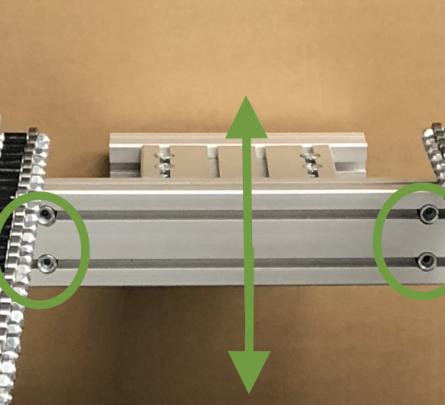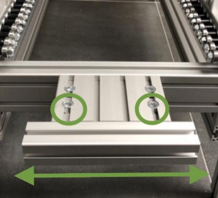 Die Abbildung zeigt, wie Sie die Räder einstellen. Stellen Sie sicher, dass die Haupträder genau in der Mitte des Laufbands stehen. Verwenden Sie dazu einen Winkel.